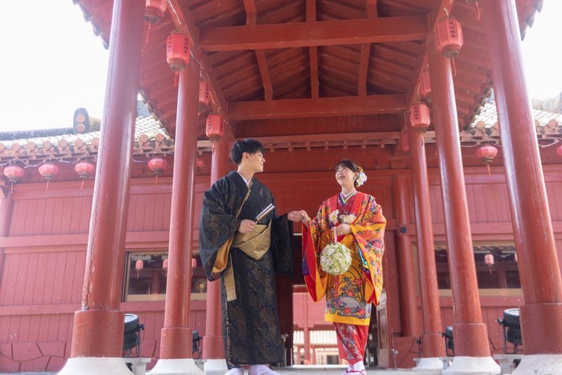 沖縄伝統の衣装・琉装とウェディングドレスの両方を着て撮影できるフォトプランです。ドレスはビーチで、琉装はテーマパーク琉球村でそれぞれ撮影します。目いっぱい フォトウェディングをお楽しみいただける、おすすめプランです。