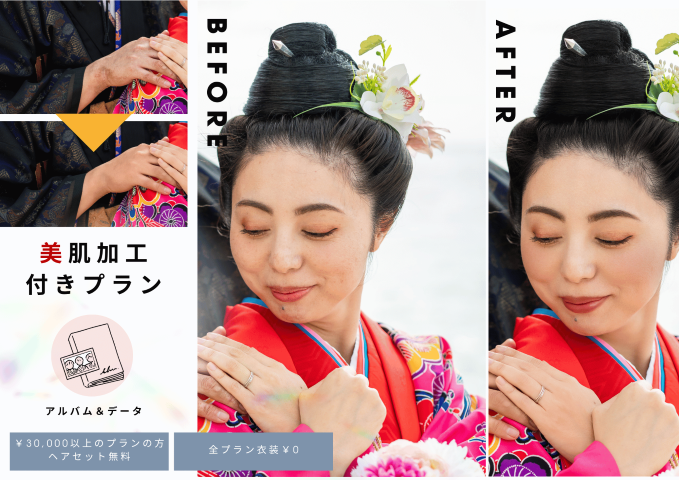 衣装、プロによる撮影、美肌加工つきの仕上がり、