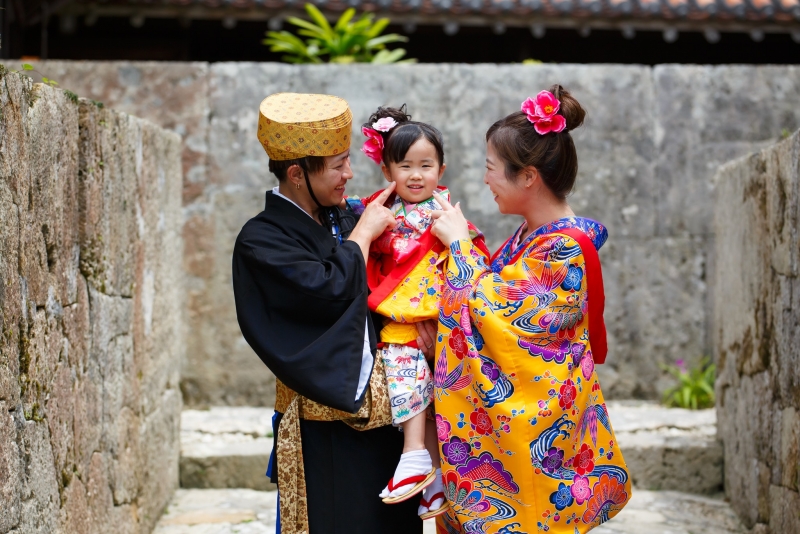 伝統的な琉装フォト。衣装選択OK、ヘアメイク・着付け込み。屋内&ロケ撮影で雨天も安心、100カットお渡し。