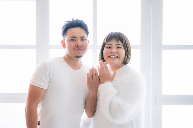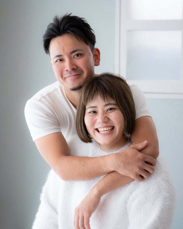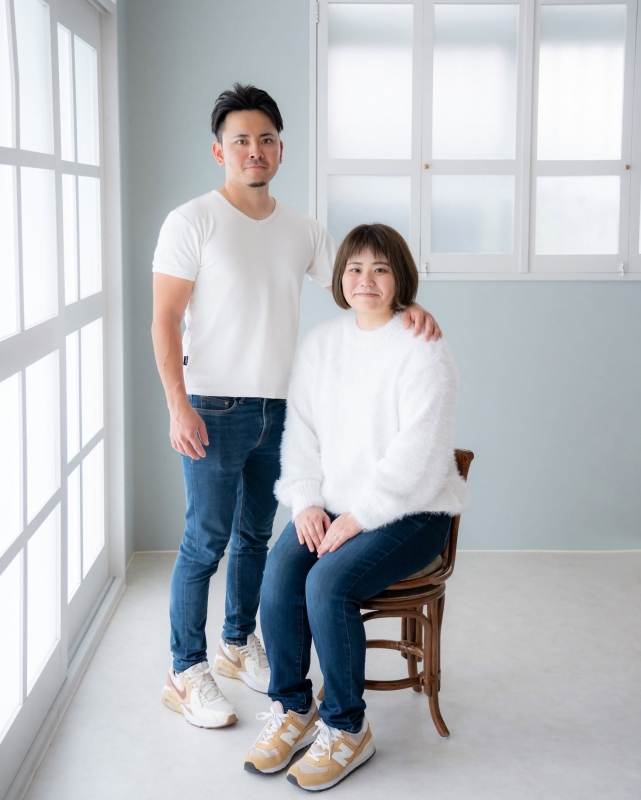 スタジオで気軽に撮影できる私服フォト。かしこまらず、旅行の思い出や記念としてのエンゲージメントフォトにもぴったりです。オプションでヘアメイクの追加も可能。