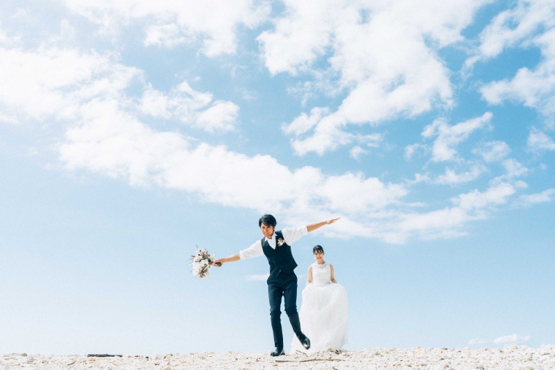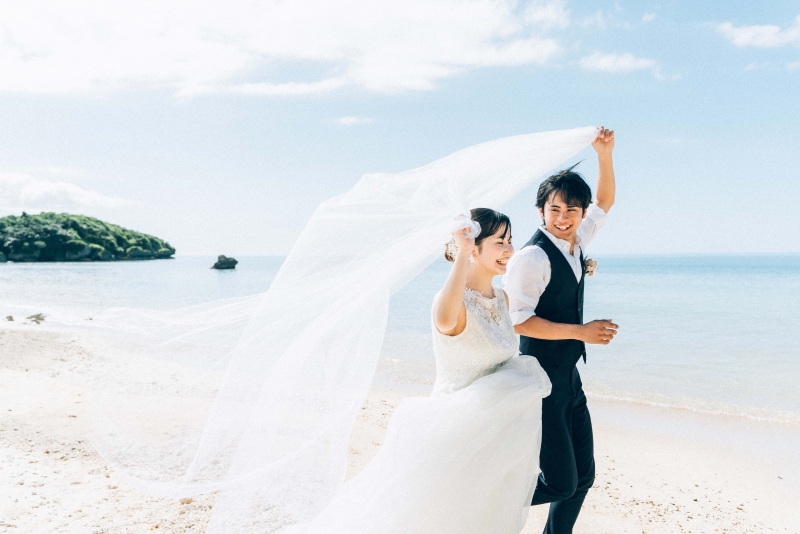 青い空とエメラルドグリーンの海に包まれて叶えるウェディングフォト。50カット納品の格安プランで、南国・沖縄のビーチを満喫。雨天保証付き。
