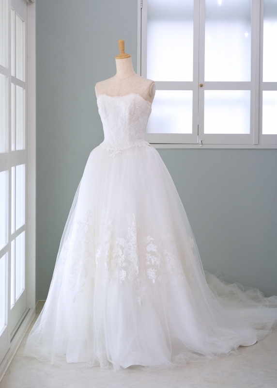 • 特徴:シンプルなデザインの中に、繊細なレースの美しさが際立つドレス。上品でやさしい雰囲気があり、花嫁さまの魅力をさりげなく引き立ててくれます。