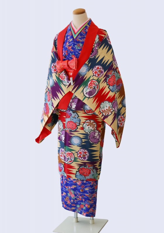 - 特徴:ライトブルーの打掛に、イエローの長着を合わせたコーディネート。爽やかなブルーと明るいイエローの組み合わせは、ポップで南国らしい雰囲気がただよいます。見ているだけで気分が明るくなるような、華やかで元気な印象。沖縄の青い海や空にもよく映える、楽しく軽やかなコーディネートです。