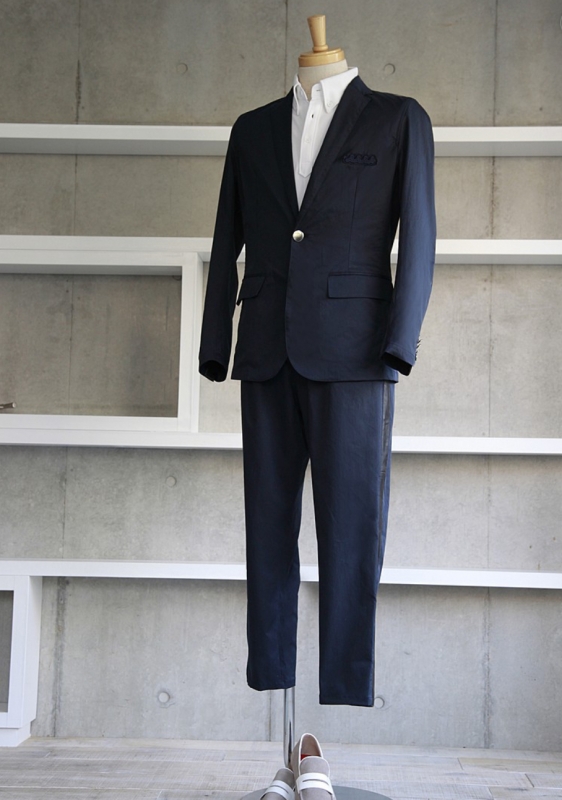 - 特徴:撥水加工が施された非常に薄いストレッチ素材を使用したテーラードジャケットとフルレングスのボトムの組み合わせです。デザインもシルエットもモダンな仕様。襟裏と袖裏に側章フェイクレザーを施しておりフォーマル感が漂います。