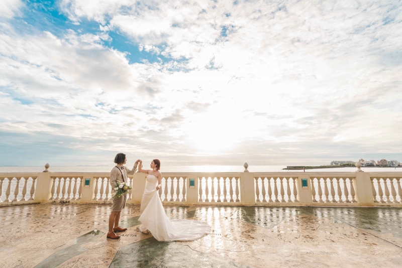 ビーチウェディングフォトと4Kドローンフォト(10カット)、ヘアセット、メイク、ウェディングドレス、アクセサリー、ブーケ、シューズ