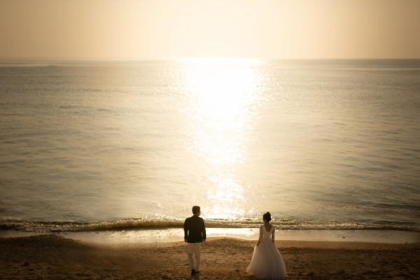 沖縄の青い海と空で撮影した後は陽が沈む時間帯でドラマティックに撮影。