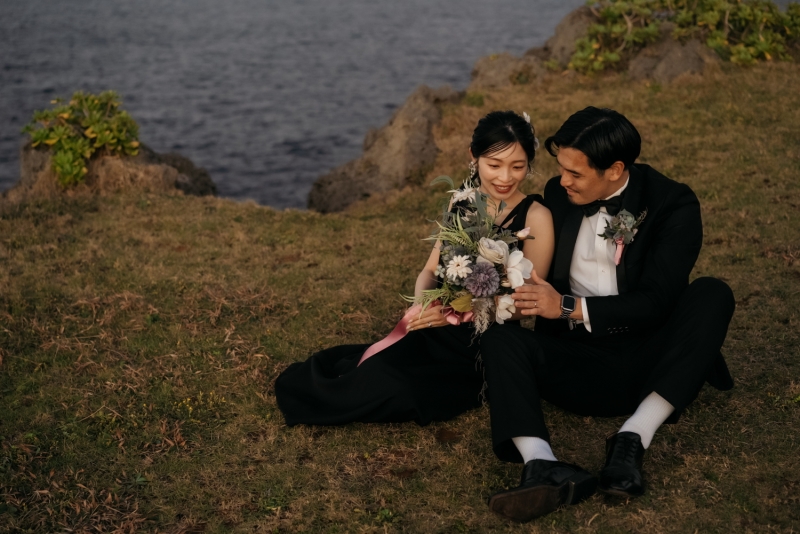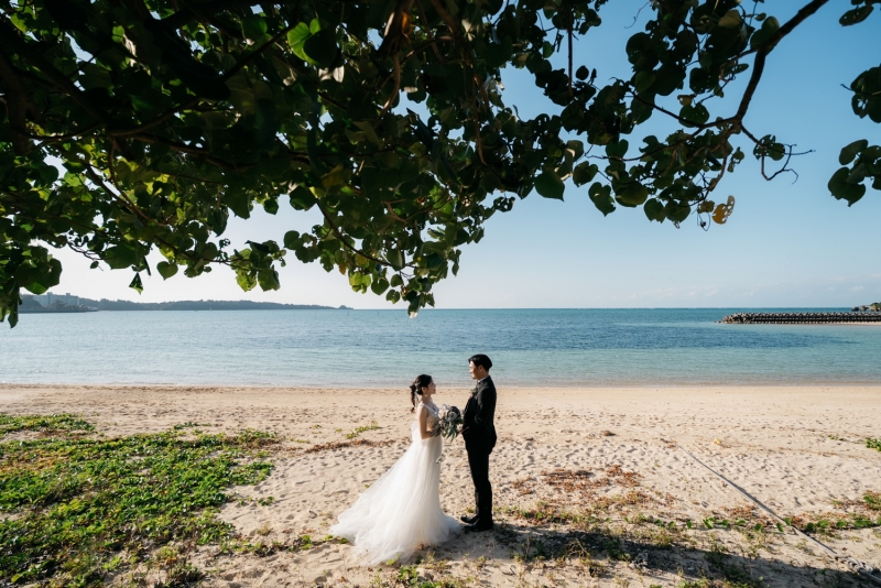 沖縄の青い海と空で撮影した後は陽が沈む時間帯でドラマティックに撮影。 衣装、新婦様ヘアーメイク、小物、移動車、データ200カット以上必要なものは全て揃っています。(ビーチ撮影ロケ地が選べます 読谷村 恩納村 豊崎 瀬底島)