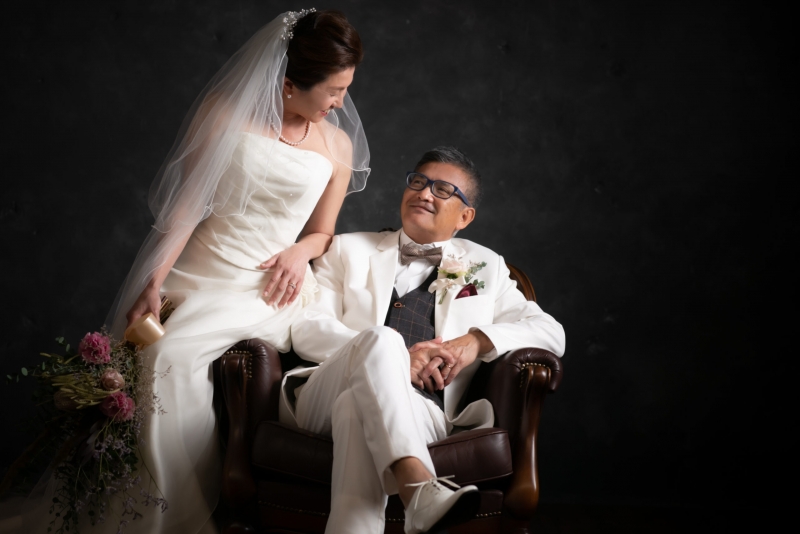 新郎・新婦衣装、新婦ヘアーメイク、小物、データ30カット以上がついたスタジオのみのプランです。ご家族やお子様とも撮影可能です。