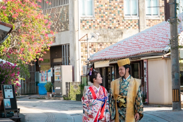 琉装を着て楽しくお散歩しませんか? やちむん巡りやショッピングなど観光している風景をプロのカメラマンが撮影するプランです。