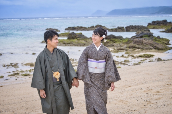 新郎新婦衣装1着ずつ、撮影、着付け、ヘアメイク、小物一式、データ200カット、島内ロケ移動車、ブーケ、ムービー、条件付きでドローン撮影もプレゼント