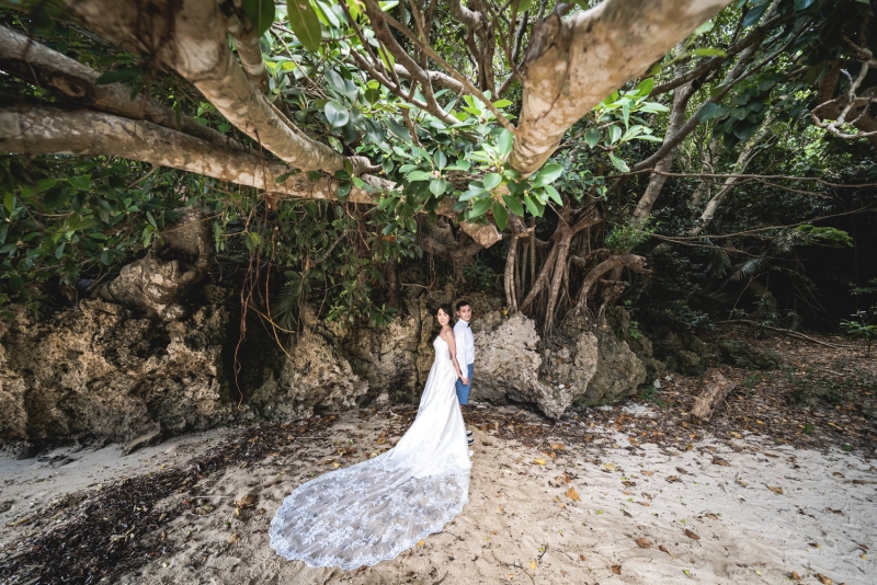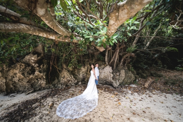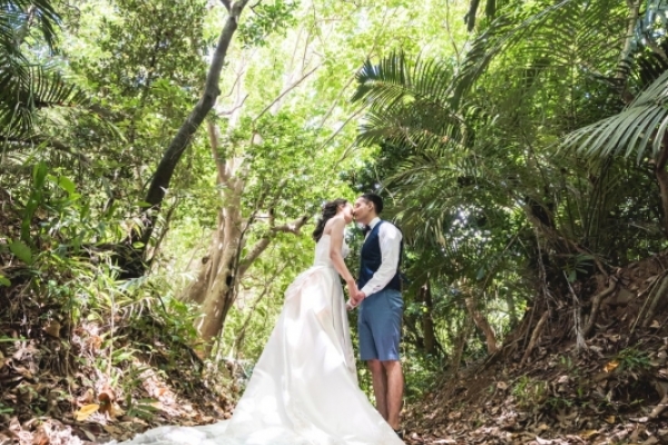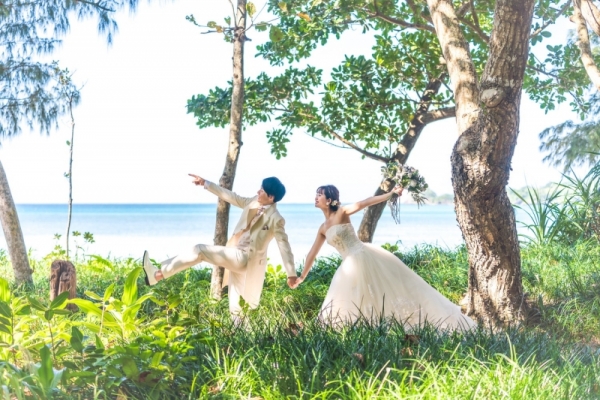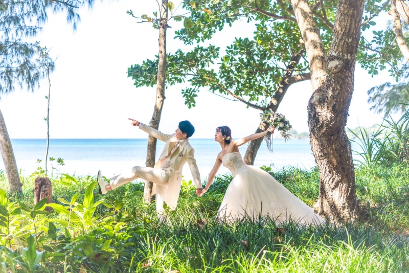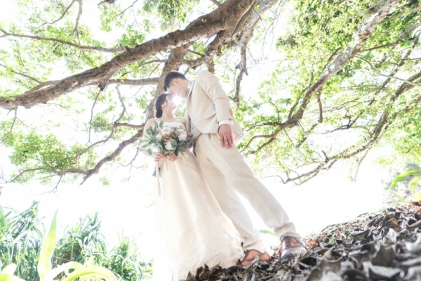 青い海の南国ビーチフォトと亜熱帯の森の2ロケーションでの撮影プラン。雰囲気がガラッと変わった写真をお求めの方にオススメです!(衣装+新婦ヘアメイク付)