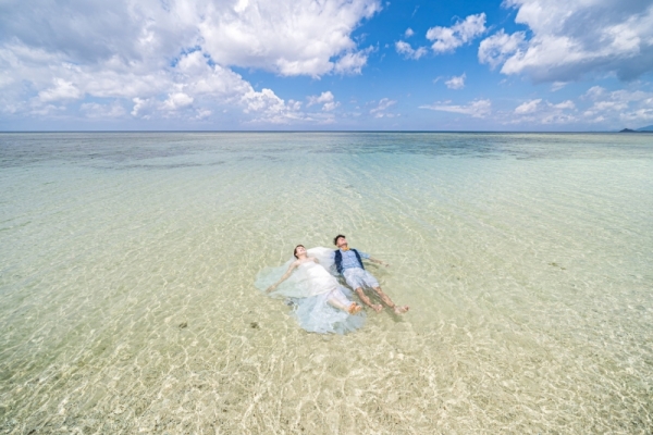 干潮の時にだけ姿を表す島なので「幻の島」とも呼ばれています。見渡す限りをエメラルドブルーの意味に囲まれた白砂の島でのフォトプランです。せっかくの無人島なので、そのまま海でも撮影しましょう!ドローンでの空撮は圧巻!(衣装+新婦ヘアメイク付)