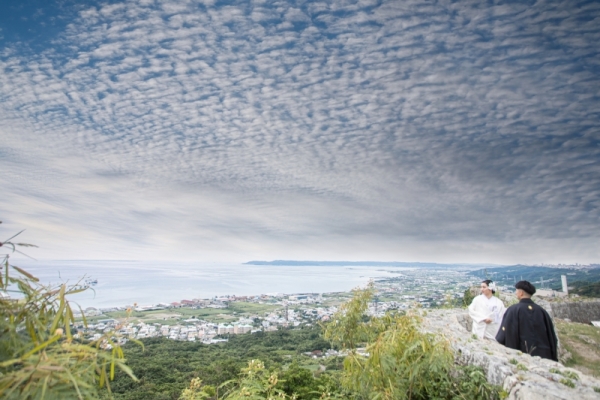 憧れのウェディングドレス、伝統美漂う着物姿。和装も洋装も両方着て記念写真を残したい。 ロケーションもそれぞれの衣装に合わせて撮影できる2スタイルプラン。 洋装はビーチや緑、和装は世界遺産の座喜味城址にて撮影。