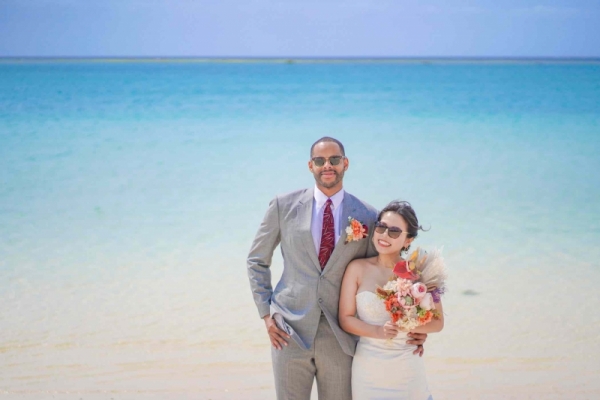 沖縄フォトウェディング定番のビーチ&グリーン撮影!もちろん衣装/ヘアメイク/写真データ150カット以上もしっかり付いてくる♪ドローン撮影オプション50%OFF対象プラン!
