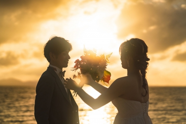 青い海でのビーチフォトの後に、西向きビーチへ移動してサンセットフォト。日没間近からドレスを着たまま海へ入ります。マジックアワーでのウォーターショットは、とっても幻想的で贅沢な時間が流れます。プレミアムを求める方に(衣装+新婦ヘアメイク付)