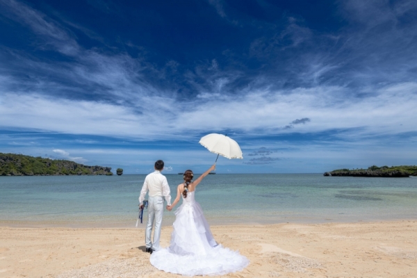 恩納村の素晴らしいロケーションのビーチフォト。ドレス100着フリーチョイス(リゾートフォトの衣裳追加平均額:約10万円)