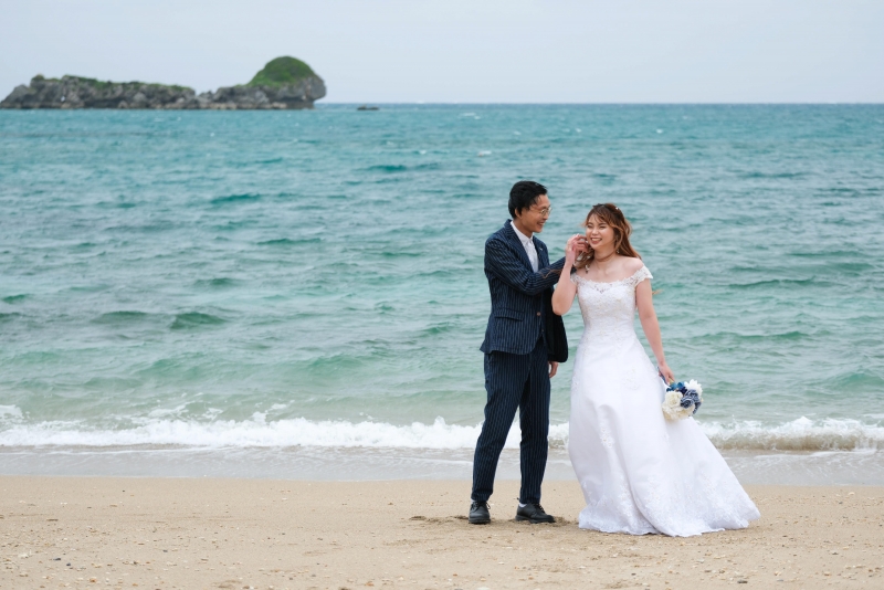 ビーチ撮影メインのベーシックプランです。店内でヘアメイク、着付け後ビーチに向かいます。これから挙式される方や、挙式後の後撮りにおススメです。