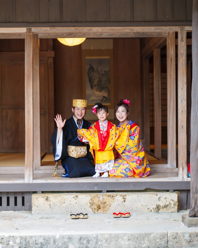 沖縄の伝統衣装「琉装」がよく映えるロケーション、中村家住宅で残すファミリーウェディングフォト。