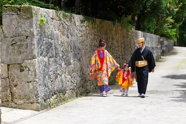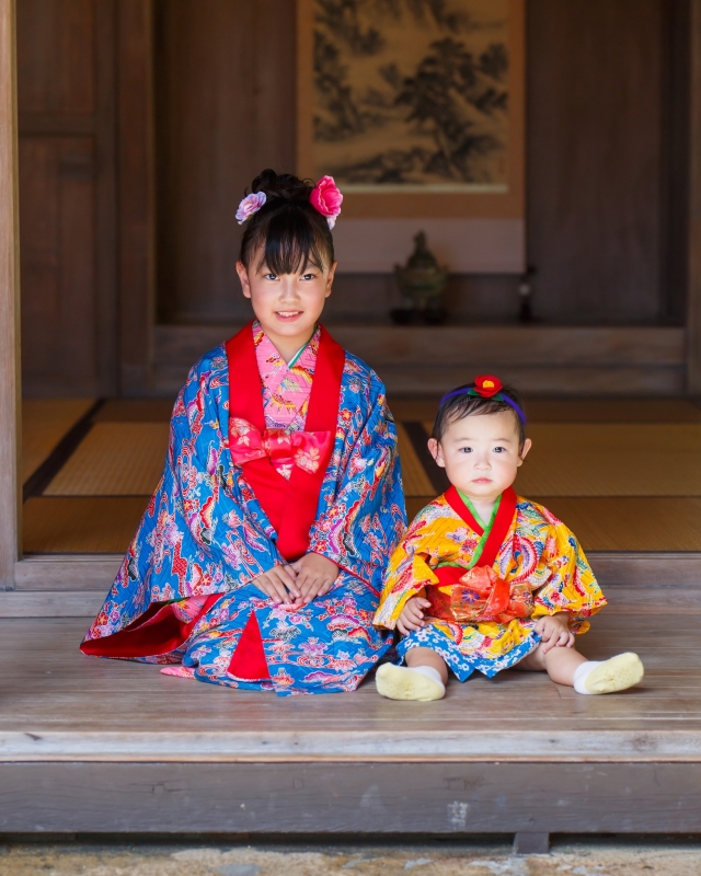 伝統的な琉装フォト。ヘアメイク・着付け込み・衣装選択OK。屋内撮影で雨天も安心。データ100カット納品。