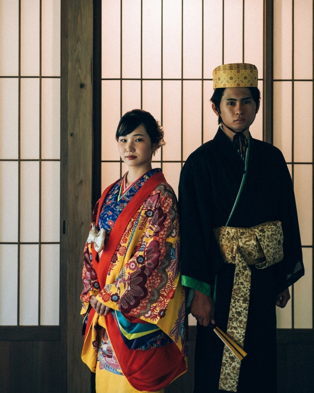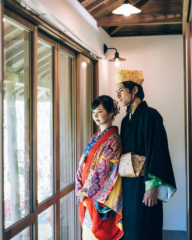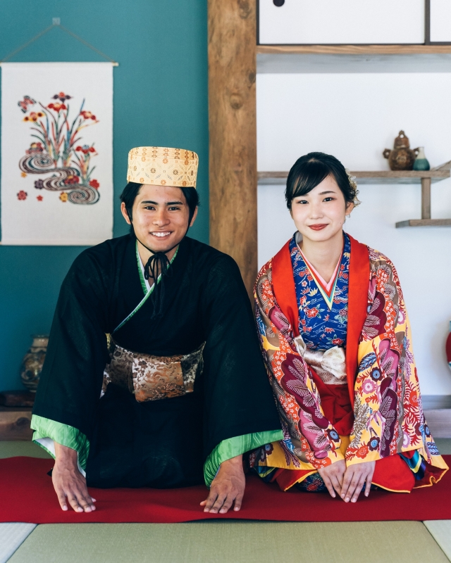 伝統的な琉装フォト。ヘアメイク・着付け込み・衣装選択OK。屋内撮影で雨天も安心。データ100カット納品。
