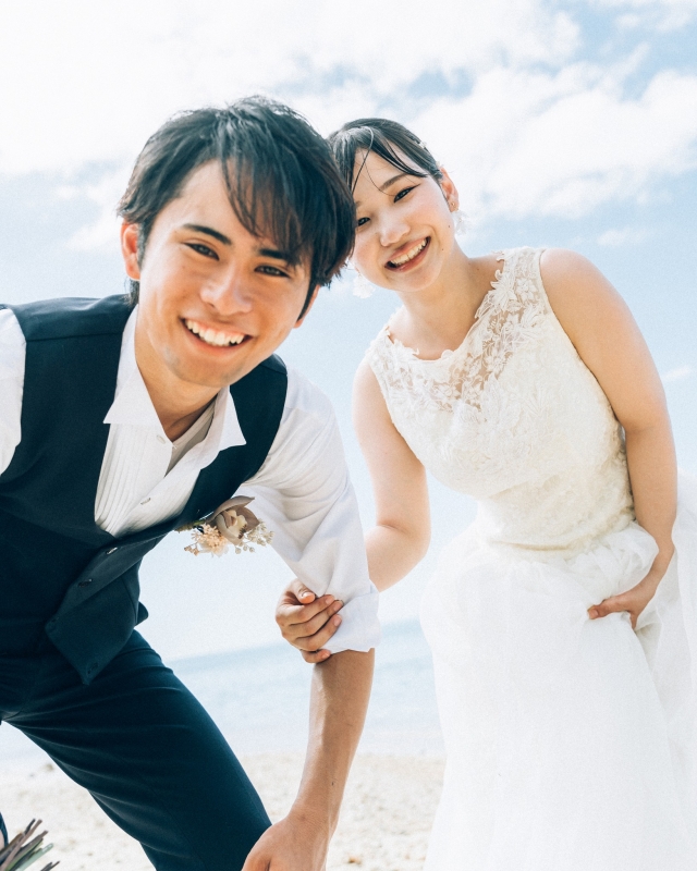 衣装持ち込み料金なし!お気に入りのドレスやタキシードで叶う格安ビーチフォトプラン。真っ白な砂浜と青い海で気軽にフォトウェディングを楽しめます。オプションでヘアメイク手配も可能です。土日祝日の金額UPなし。