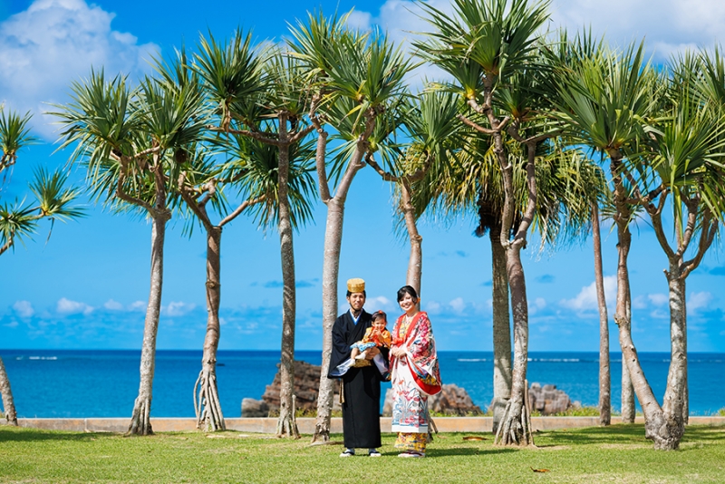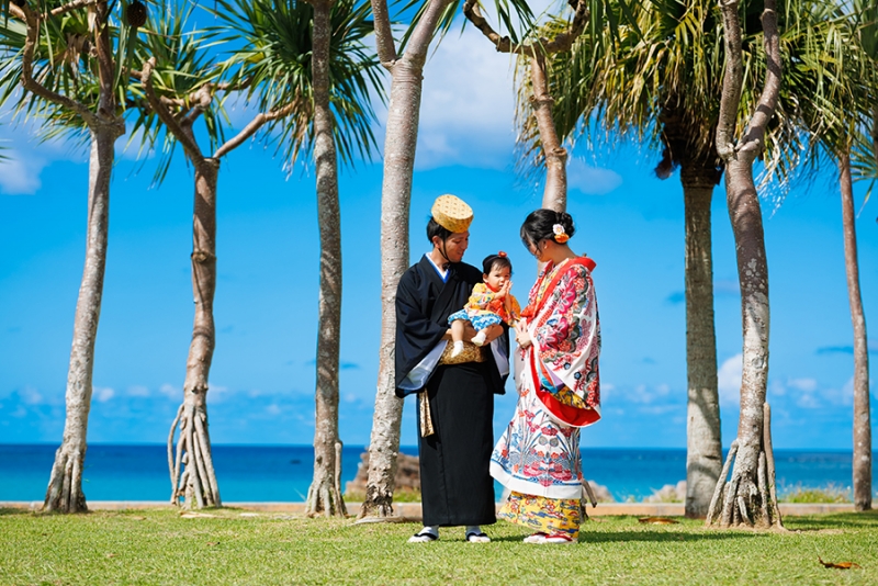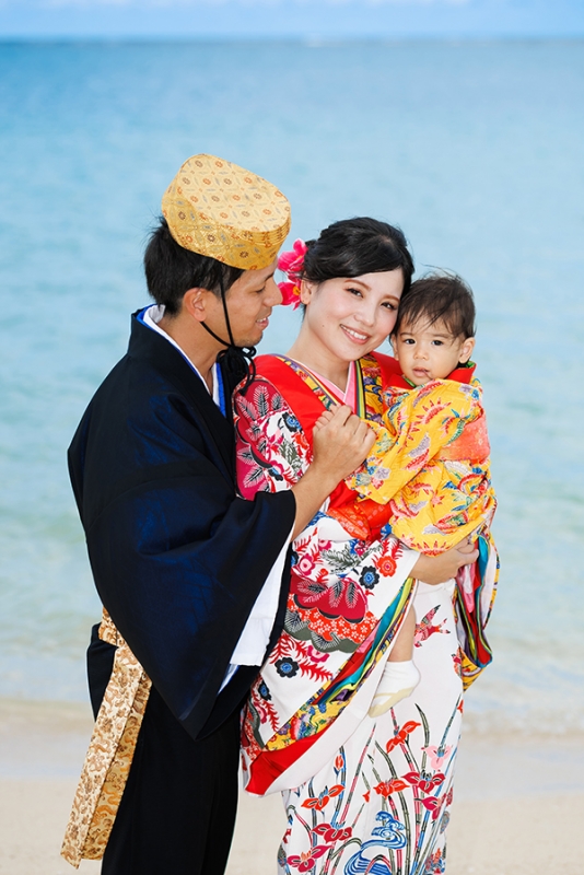 沖縄の伝統衣装「琉装」がよく映えるロケーション、アラハビーチで残すファミリーウェディングフォト。
