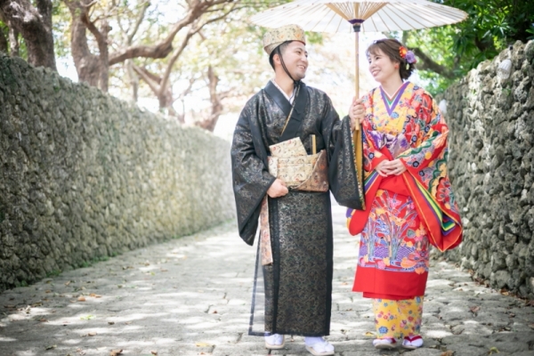憧れのウェディングドレス、伝統美漂う着物姿。和装も洋装も両方着て記念写真を残したい。 ロケーションもそれぞれの衣装に合わせて撮影できる2スタイルプラン。 洋装はビーチや緑、和装は世界遺産の座喜味城址にて撮影。