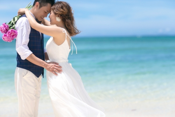 沖縄伝統の琉装とウェディングドレスの両方を着て撮影できるフォトプランです。洋装はビーチ、琉装はむら咲むら(15 世紀の沖縄の生活をモチーフにしたカルチャー パーク)でそれぞれ撮影します。フォトウェディングをお楽しみいただけるプランです。